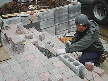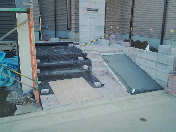 ブロック塀がある程度できたところで 階段をつくり始めました。 今回は特殊ブロックを使っています。 |