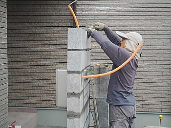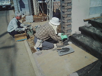 門柱とシャッターゲートにタイルを 張っていきます。 |