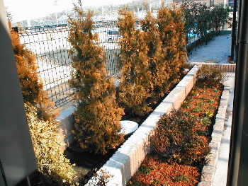 駐車場の脇にはコニファーを植栽し、 緑で暖かい雰囲気を出しました。 |