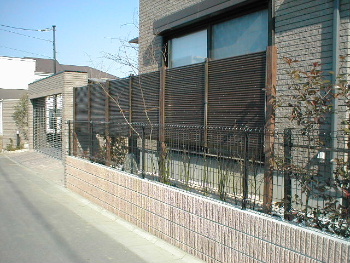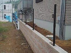 平行してブロック塀もつくり続け、 フェンスの柱まで施工終了。 |