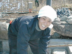 | げんさん | 造園工事大好きの根っからの職人 赤いちゃんちゃんこには見向きもせず、木や土の感触がたまらないといって軍手もはめずに、故事やいわれを語りつつ体を休めることなくパワフルに働いてくれるありがたい人。 職人気質が気にさわられたらゴメンナサイ・・・。 |