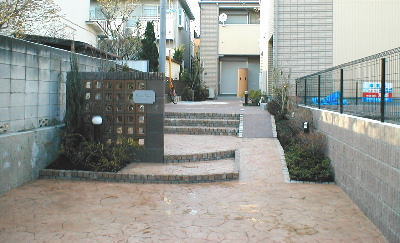 造園担当の職人が植木を植栽して完成です。 使う方々の気持ちになってデザインした玄関周りです。 自転車やバイクも楽に通ることができます。 |